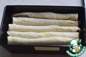 11. Таким образом поступаем со всеми кусочками теста. У нас получится 7 длинных трубочек. Разрезаем каждую на 2 равные части и выкладываем в форму.