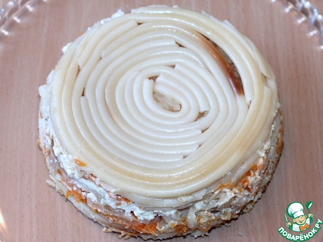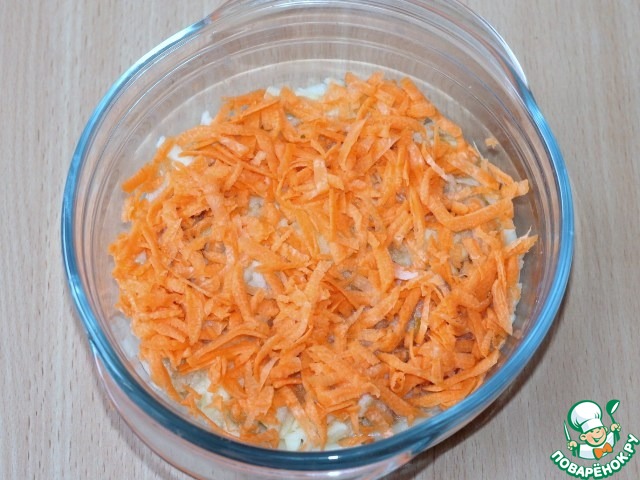 4. Морковь чистим и трем на средней терке, кладем 1/2 часть на слой яблока.