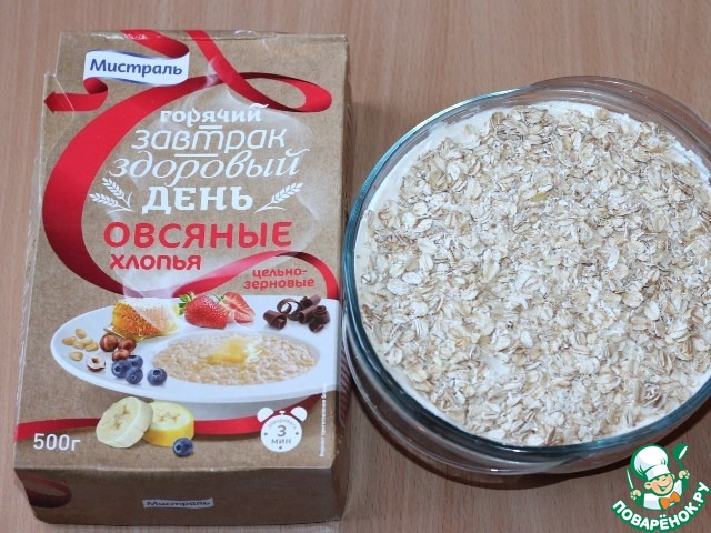 6. Затем повторяем слои и сверху посыпаем овсяными хлопьями. Хлопья утопить ложкой в сметане.