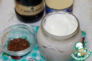 Сметану, ликёр, кофе и сгущённое молоко смешать, дать постоять 5 минут (чтобы растворился кофе и взбить в течении нескольких секунд)