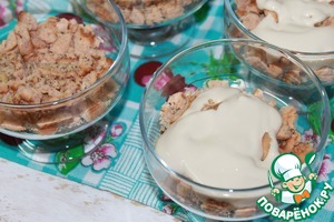 Печенье перемешать с молотыми орехами и начать выкладывать в креманки.
