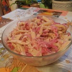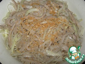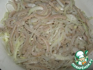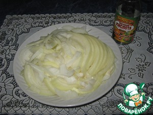 Лук очистить, нарезать тонко полукольцами, замариновать в уксусе на 15 минут.