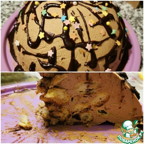 Перевернуть торт на блюдо. Застывший крем хорошо держит форму.