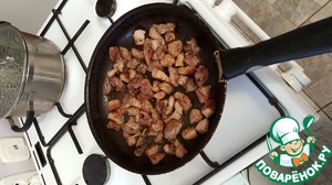 Берем сковороду и раскалываем на ней растительное масло, потом обжариваем мясо до румяного цвета на сильном огне.