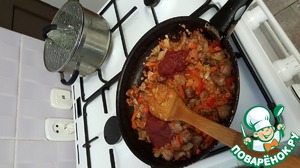 Жарим все вместе 5 мин не закрывая крышкой. -