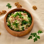 Сытный, вкусный и простой в приготовлении салат! Легкий, еле уловимый аромат орехов добавляет особый шарм блюду, хотя сразу и не поймешь, что в блюде присутствуют орехи.