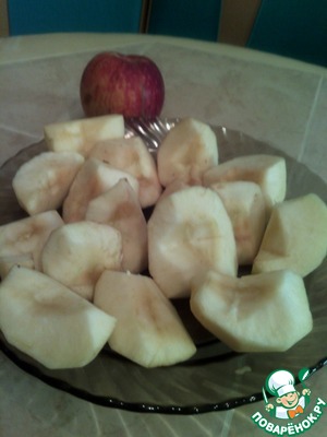 Яблоки ( у меня Китайские зимние) очистить от кожуры, семян и разрезать на 4 части. Положить на тарелку и запечь в микроволновой печи ( я ставлю на 7 минут) на максимальную мощность, т. е 900 Вт.