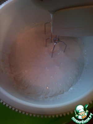 Также не прекращая взбивать тонкой струйкой добавить еще горячий сироп.
