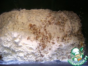 В чашу хлебопечки выложить овощное пюре, добавить масло и соль, всыпать просеянную муку и целые хлопья. В последнюю очередь сверху положить дрожжи. Я для хлебопечки использую такие, которые нужно просто смешать с мукой. Включить замес и подъем теста.