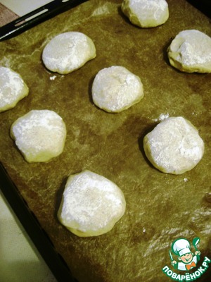 Готовое тесто разделать на маленькие булочки смазанными руками. Тесто немного липкое, но формуется неплохо и пахнет очень аппетитно. Наш пес клянчил кусочки теста вприпляску. Обмакнуть булочки в муку и уложить на лист, оставляя место для подъема. Дать расстояться минут 20. Я последнюю расстойку делаю в духовке при включенной конвекции и температуре в 70 градусов.