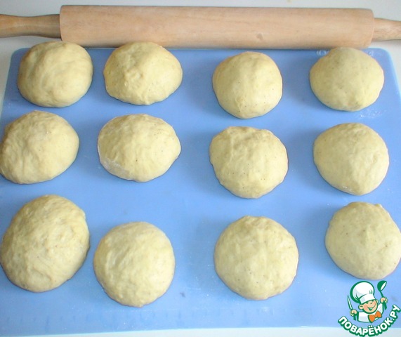 Дать снова подойти, тесто взвесить разделить на 12 шариков. Каждый шарик подкатать, дать отдохнуть тесту 5 минут. Тесто довольно липкое, муку не добавлять.!!! Это важно!!! Формировать булочки на силиконовом коврике, либо смазать стол растительным маслом.