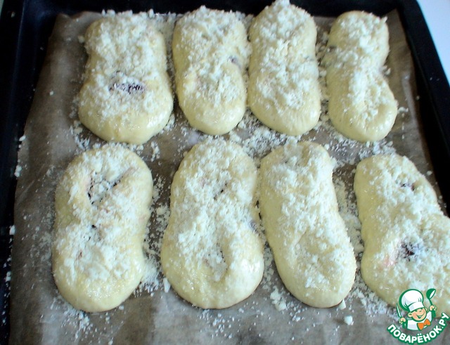 Поставить на расстойку на 50 мин, пленку побрызгать растительным маслом и прикрыть булочки. Перед выпечкой смазать яйцом, обсыпать штрейзелем, выпекать 15 мин при 180 гр в разогретой духовке.