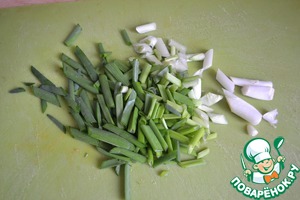2 пучка зеленого лука так же нарезаем. Отправляем в бульон.