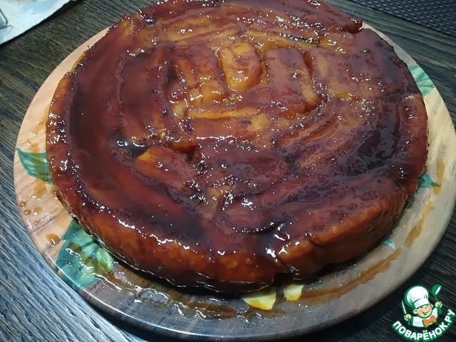 Разогреваем духовку до 180 град. В форму сухую выливаем карамель, на нее быстренько кладем бананы, сверху заливаем тестом. И в духовку минут на 30. По рецепту 20 минут, но у меня он стоял думаю 35 точно, т. к. сверху был ещё бледненький совсем. А так, как обычно смотрите по своей духовке, и от формы еще зависит. Когда пирог будет готов, даем ему постоять несколько минуток, видимо, чтобы схватилась карамель, и перевернуть на блюдо. У меня часть карамели осталась на форме, возможно я слишком рано перевернула или наоборот, но пирог всё равно получится очень красивый и безумно вкусный!!