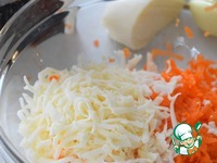 Сулугуни так же натереть на крупной терке и добавить к тыкве.