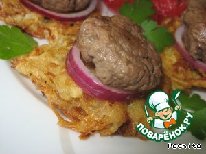 Положите готовые драники на тарелку, сверху положить колечко лука и котлетку.