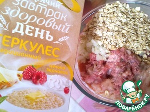 Теперь добавим мясной фарш (у меня курино-свиной), измельченный лук, овсяные хлопья "Геркулес" ТМ "Мистраль".