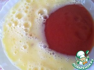 Добавить к взбитым яйцам томатную пасту и перемешать.