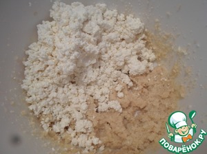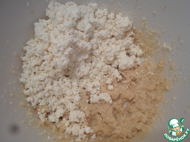 Затем добавляем творог. Так же с помощью миксера вымешиваем однородную массу.