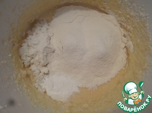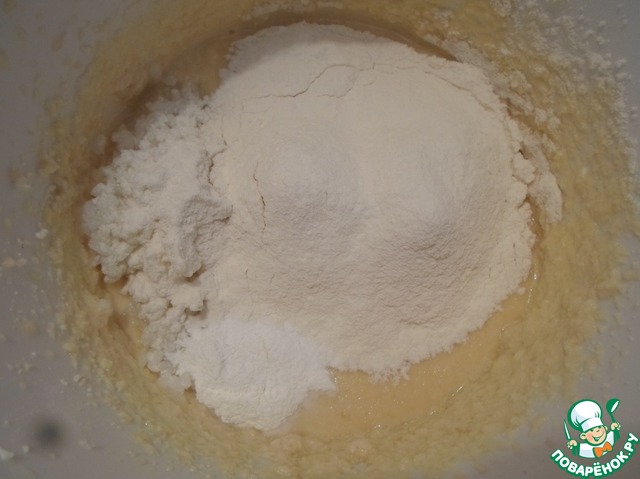 Сразу же вводим просеянную муку и разрыхлитель, тщательно вымешиваем.