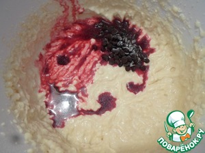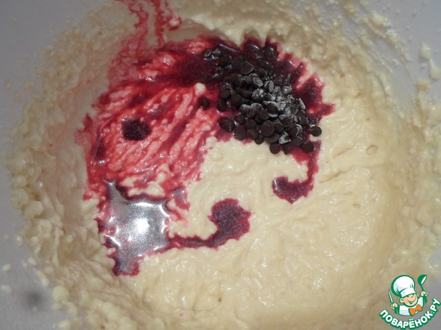 Сок и шоколадные капли вводим в тесто и перемешиваем.