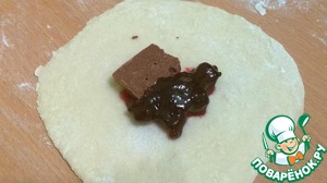 Разделить тесто на кусочки. Кусочки раскатать в кружечки или овальчики, как нравиться и удобнее! Положить начинку: варенье и шоколад! Варенье в целом может быть любое! Чем больше начинки, тем вкуснее! Кружечек с начинкой превратить в кулечек))