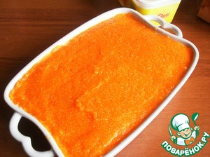 В форму, смазанную маслом, выкладываем слоями тыкву и творог. У меня вышло три слоя тыквы и, соответственно, два слоя творога.