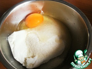 В творог добавляем оставшиеся яйцо, сахар, ванильный сахар и манку. Отжимаем изюм и добавляем к творогу. Я не добавляла, дети не любят.