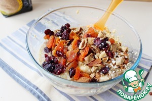 Добавить сухофрукты и орехи в яично-маслянную смесь, перемешать.