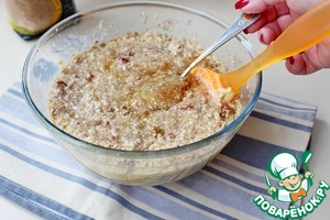 Добавить просеянную ц/зерновую муку, пшеничную и разрыхлитель, перемешать.