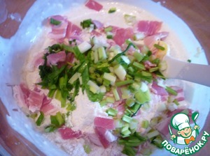 Муку, разрыхлитель, бекон и лук.