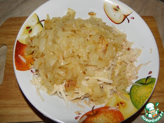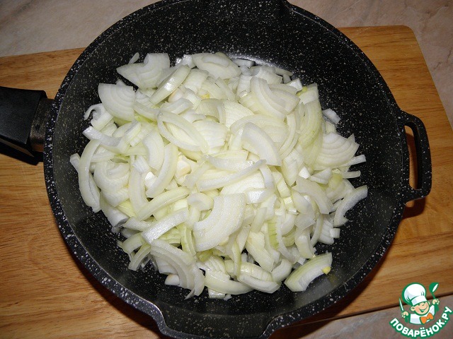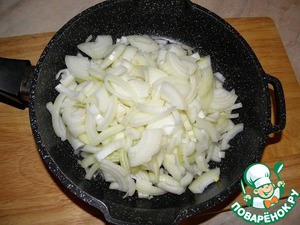 Обжариваем лук до легкой золотистости, чуть посолить.