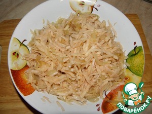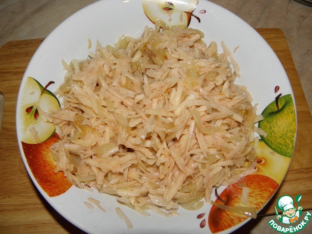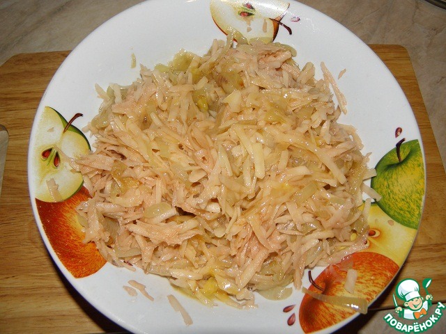 Нарезаем лук, на сковороду добавляем растительное масло ( тут два варианта, или добавить половину нормы указанной в рецепте, а остальную половину добавить в картофельную массу, но я выливаю все масло на сковороду, и потом все остатки добавляю в картофель)