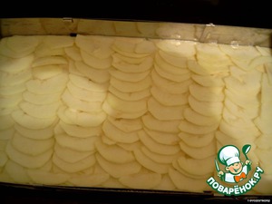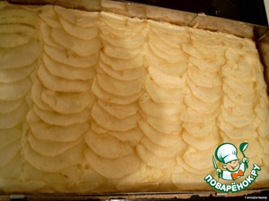 Яблоки разрезать пополам, вырезать серединку и почистить, нарезать на тонкие дольки (чем толще дольки, тем сочнее получится пирог)