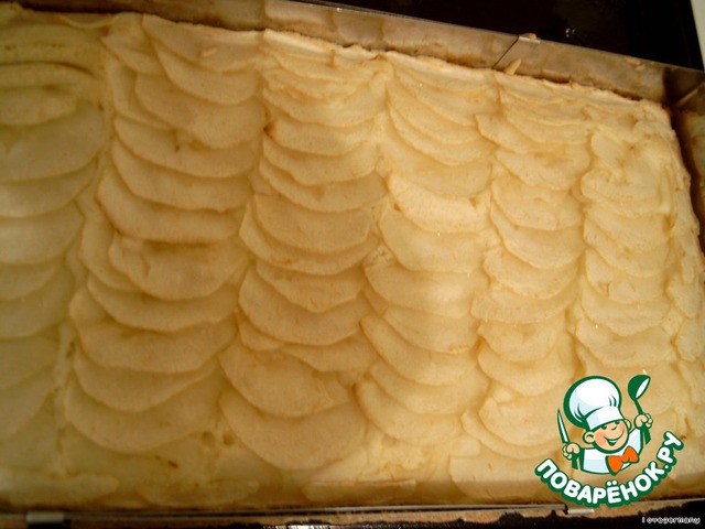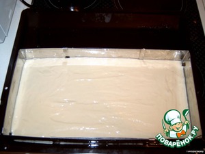 Вылить тесто в смазанную маслом форму (я выпекаю с помощью раздвижной рамки для пирогов, длина с размер противня, ширина 3/4 противня). Можно сделать и на весь противень, но тогда пирог будет тоньше. -