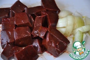 Говяжью печень зачищаем от жира и жилок, режем кусочками, также крупными кусками режем репчатый лук.