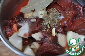 В сотейник кладём печень, лук, добавляем соль, сухой базилик, смесь перцев, лавровый лист, красное сухое вино, заливаем всё бульоном.