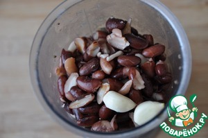 Готовой печени даём немного остыть, перекладываем в чашу блендера (можно использовать мясорубку), добавляем фасоль и чеснок, тщательно измельчаем.