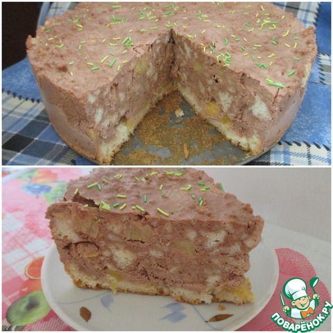 В оставшийся мусс выложить бисквитные кусочки и оставшиеся ананасы, перемешать и выложить поверх мусса