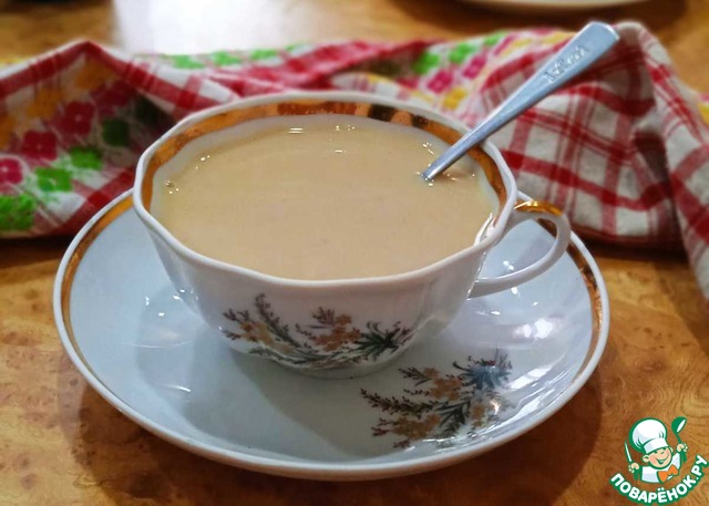 Берут поровну воду и молоко, на стакан напитка 5-6 грамм прессованного чая, пол-чайной ложки сливочного или топленого масла и соль по вкусу.