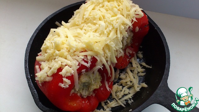 Удалить плодоножку и семена у перца, нафаршировать его, сложить в форму для запекания и посыпать тертым сыром.