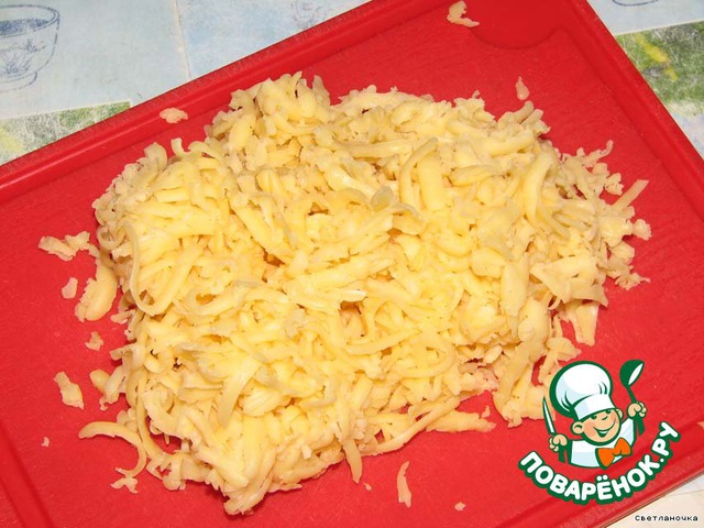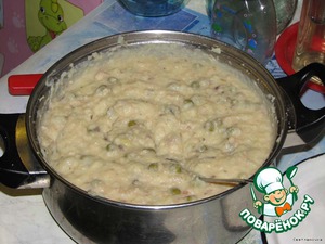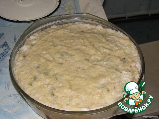 Нагреваем молоко и делаем картофельное пюре - оно должно быть однородным и не очень густым. Добавляем в него соль и перец, сыр, пока не расплавится. Затем добавляем яичные желтки, зелёный горошек и рыбу.