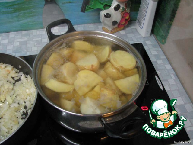 Пока варится картофель режем и обжариваем лук на сливочном масле