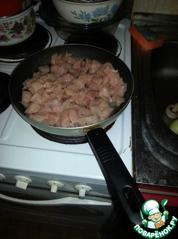 Филе курицы (я брала уже без костей и кожи) режем на небольшие кусочки и жарим на растительном масле минут 20