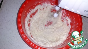 Продолжая взбивать, всыпать муку и кокосовую стружку. Муку здесь можно пробовать любую. В оригинале рецепта используется кукурузная мука, я ее не нашла и добавила овсяную.
