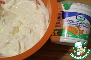 Маскарпоне смешиваем с йогуртом и сахарной пудрой по вкусу, мешаем вручную венчиком