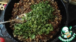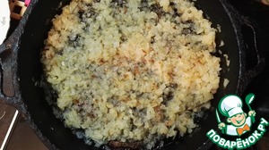 Пока жарится лук, моем и мелко нарезаем грибы. Зысыпаем их в готовый лук и тушим. Грибы могут выделить воду, тушить надо пока не выпарится вода, чтоб можно было поджарить их.
