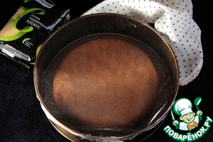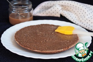 Тем временем разрезать на коржи остывшую основу (у меня их получилось 4шт.). Пропитать их сиропом, средние коржи пропитать с обеих сторон, нижний корж пообильней. Сироп истратится весь и не переживайте, что коржи будут "мокрыми", получается все идеально.