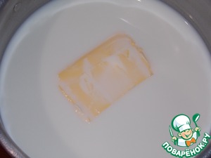 В 450гр. молока добавить масло или маргарин, поставить на огонь до полного растворения масла.