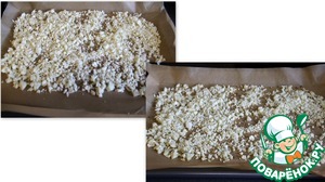 • Выкладываем измельченную цветную капусту на протвинь, застеленный пергаметной бумагой и ставим в предварительно нагретую до 220С (400F) духовку на 12-15 минут.